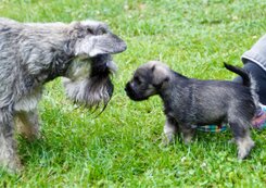 Am 01.01.2024 ist abends der K-Wurf geboren worden. Unsere Florentine hat einen gesunden, kleinen Rüden zur Welt gebracht. Es ist ihr erster Nachwuchs, aber wie auch alle anderen Mädels aus unserem Rudel macht auch Sie einen tollen Job als Mama und kümmert sich großartig um den kleinen. Der kleine ist aber inzwischen gar nicht mehr so klein und zeigt einen ordentlichen Appetit. Er nimmt kontinuierlich zu und hat seit heute die Augen auf gemacht. Wir freuen uns auf eine tolle Welpenzeit mit einem kleinen Schnauzer Jungen.