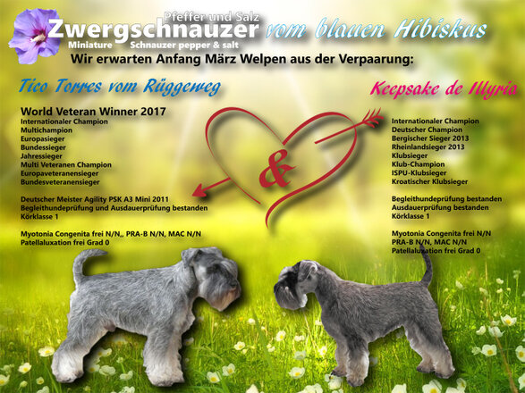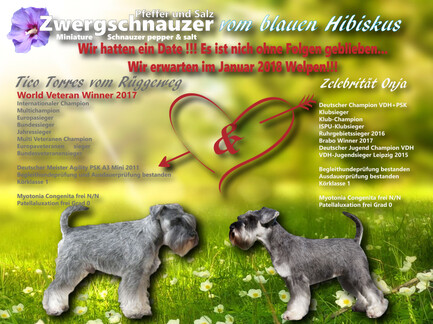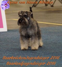 Pfingsten waren wir in Saarbrücken. Bei der Internationalen Ausstellung erhielten Arjena vom blauen Hibiskus und Alfons vom blauen Hibiskus jeweils V1 in der Jugendklasse und beide wurden Saarland Jugendsieger 2016. Arjena wurde beste Zwergschnauzer pfeffer-salz Hündin und Alfons bekam das Jugend-BOB. Außerdem erfüllt Alfons nun alle Voraussetzungen für den Deutschen Jugend Champion VDH!!!