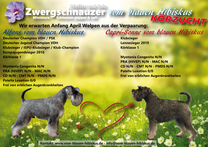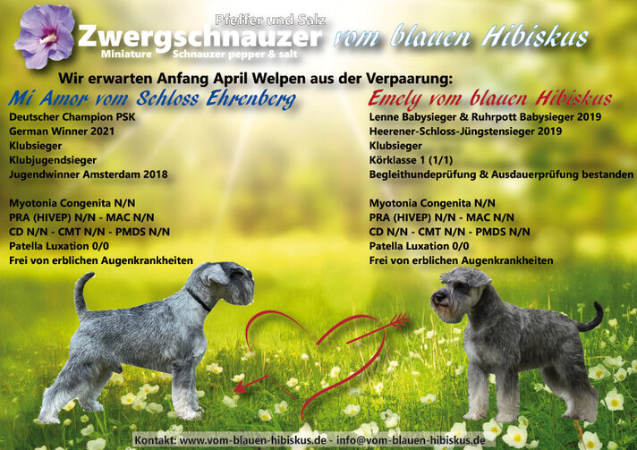 Wir freuen uns sehr, zwei Würfe für den April ankündigen zu können. Wir erwarten Welpen aus zwei Verpaarungen. Einmal von Capri und von Alfons und einmal von Arjena und von Mi Amor vom Schloss Ehrenberg (Mio).