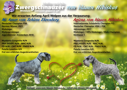 Wir erwarten Ende Juni 2025 den M-Wurf. Mutter wird unsere Henriette vom blauen Hibiskus sein. Vater ist In golf vom blauen Hibiskus. Wir haben nun auch eine neue Rubrik auf die Homepage gesetzt - unsere Deckrüden bzw. in Vermittlung stehenden Deckrüden sind auf der Homepage aufgelistet. Sie haben alle Gesundheitsuntersuchungen, Ahnentafel des PSK und sind frei on erblichen Augenkrankheiten. Bei Interesse an einem der Deckrüden, melden Sie sich gerne bei uns.